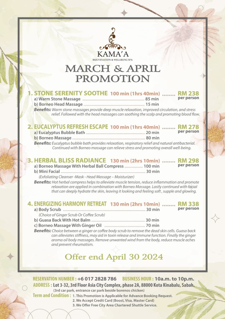 Embrace the blooming beauty of spring with our exclusive March and April promotion at Kama’a Rejuvenation & Wellbeing Spa.🌸